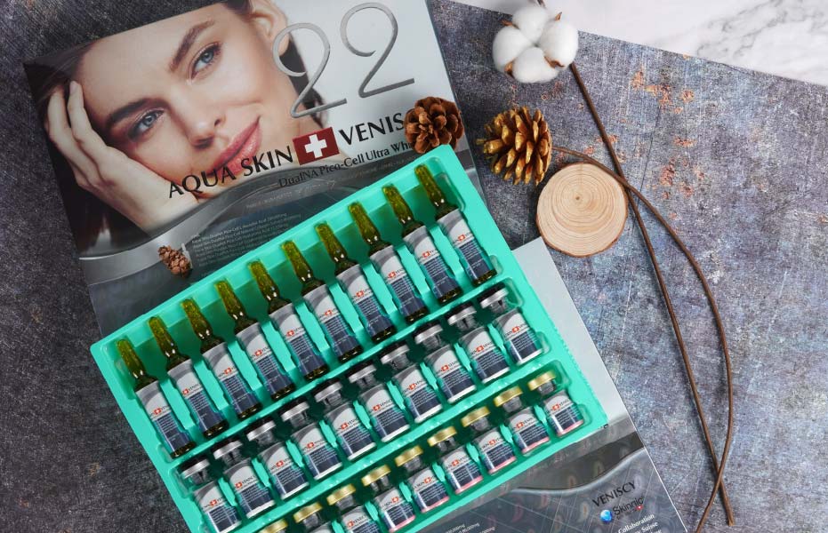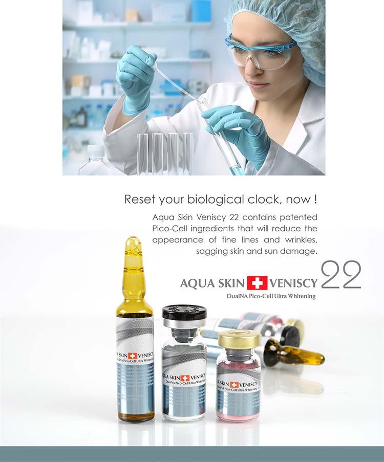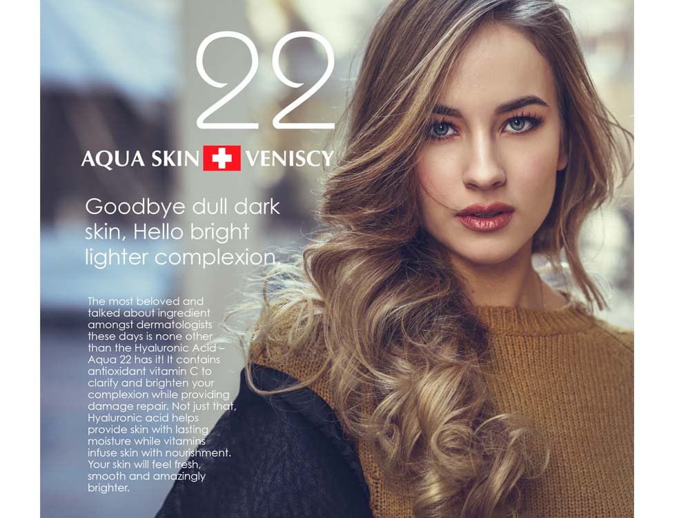 Aqua Skin Veniscy 22 is a revolutionary skin-enhancing formula powered by advanced Suisse technology. It combines ultra-concentrated whitening agents, collagen boosters, and powerful antioxidants to promote a visibly youthful, radiant, and flawless complexion.