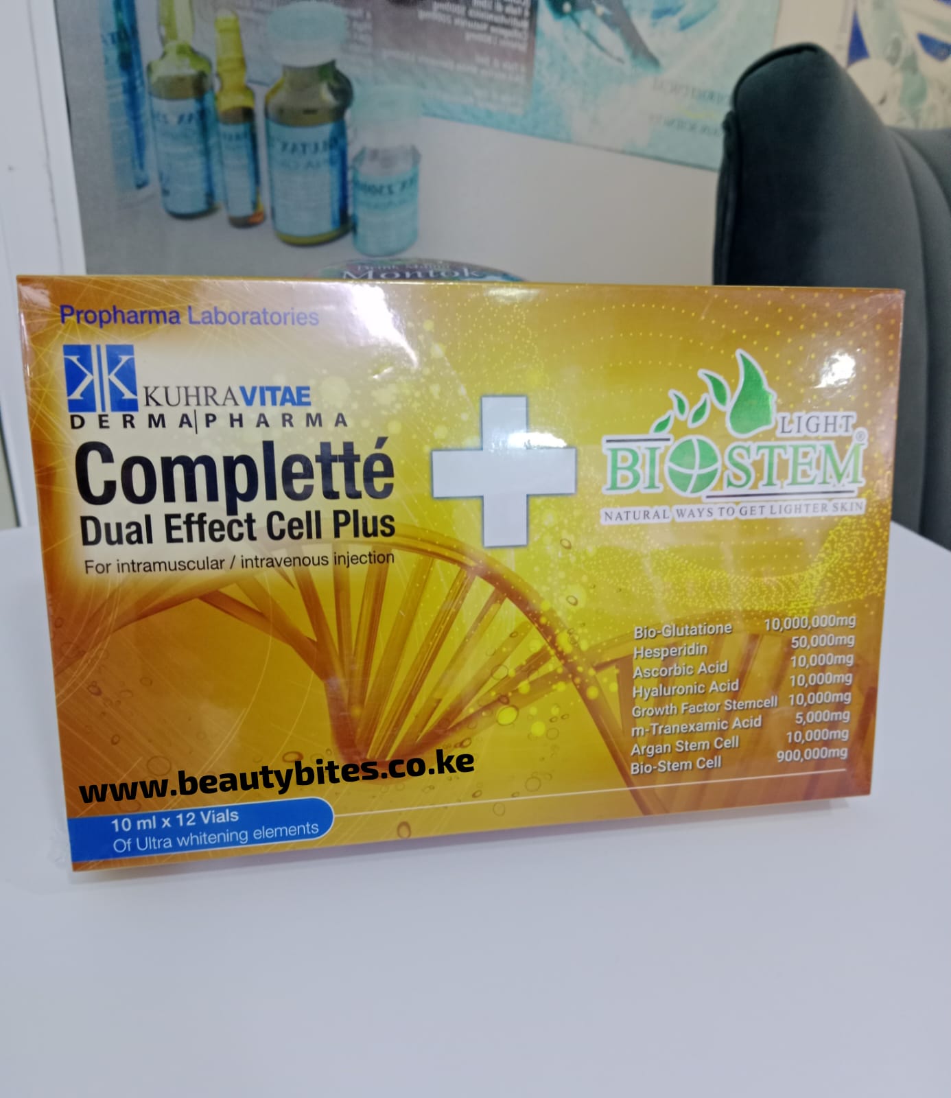 Complete Dual Effect Cell Plus is an injectable skincare solution formulated to provide ultra-whitening effects while improving skin health. Designed for intramuscular/intravenous administration, it promotes a brighter, more youthful complexion through a powerful mix of stem cells, glutathione, and hydration-enhancing compounds.