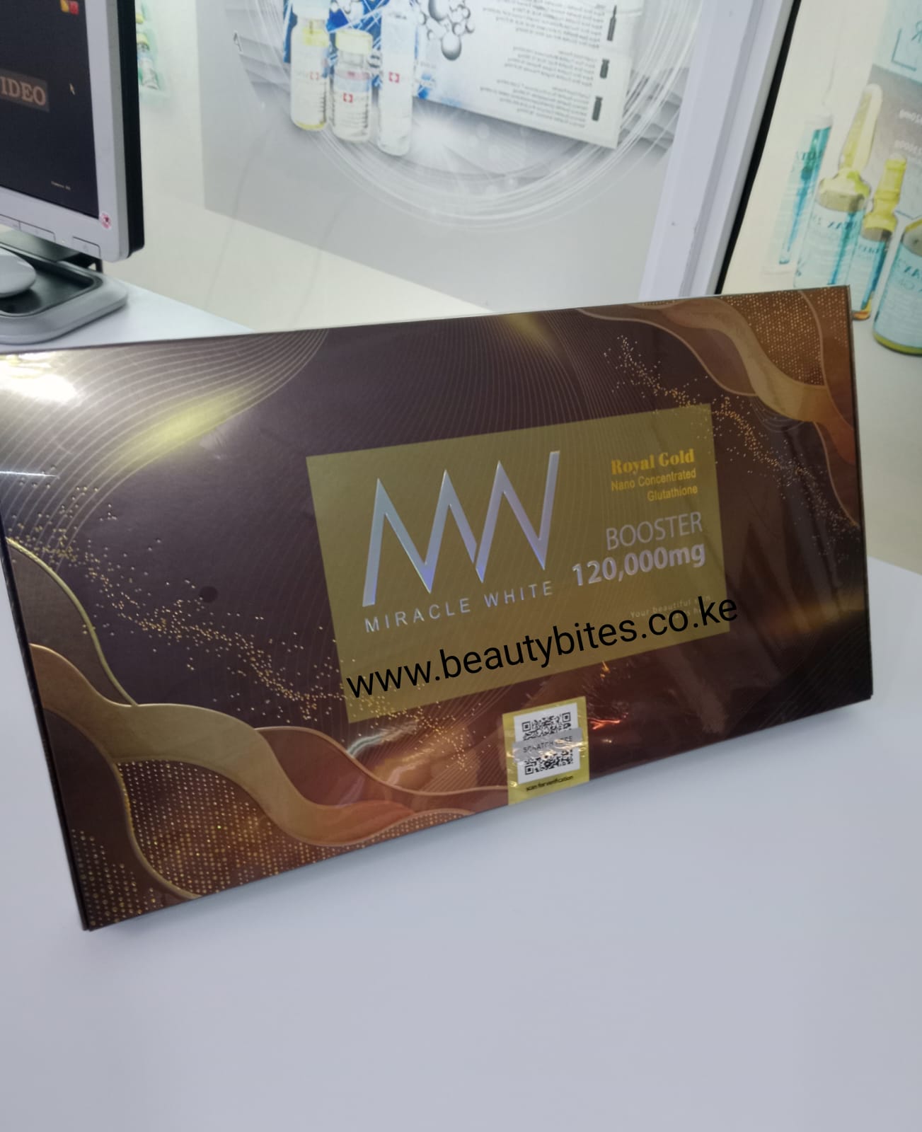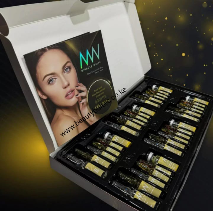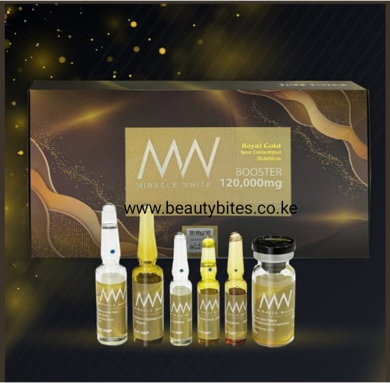 Miracle white royal gold nano concentrated glutathione booster 120,000mg is a high-strength skin enhancement formulation containing Glutathione,Vitamins ,antioxidants ,peptides ,and skin repair compounds .It is commonly marketed for skin brightening ,Anti-aging , detoxification and skin rejuvenation support , often administered in professional aesthetic treatmen